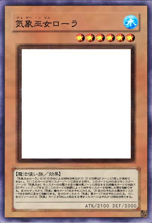 | 「気象巫女ローラ」の(4)の方法による特殊召喚及び(2)(3)の効果は1ターンに1度しか使用できない。(1):このカードがモンスターゾーンに存在する限り、このカード以外の自分モンスターゾーンの「気象巫女」モンスターの攻撃力を自分魔法罠ゾーンに存在する永続魔法カードの枚数×200ポイントアップする(2):このカードの戦闘によって相手モンスターを破壊した場合発動できる。自分のデッキから「気象」魔法カード1枚を手札に加える。(3)自分の手札の水属性モンスター1体を相手に見せて発動できる。自分のデッキから「気象」罠カード1枚を手札に加える。(4):自分フィールドに「気象」カードが2枚以上存在する場合このカードは手札から特殊召喚できる。 | |||