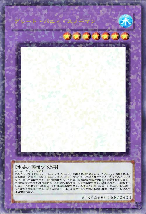 | バニィ・スノーマン×3 このカードは「グレート・バニィ・スノーマン」の融合素材にできない。このカードを融合素材とする場合、このカードは「バニィ・スノーマン」3体分として扱う事ができる。①:このカードをリリースして発動できる。自分の墓地から、このカードの融合召喚に使用した融合素材モンスターを3体まで選んで特殊召喚する。この効果は相手ターンでも発動できる。②:このカードが相手モンスターと戦闘を行ったダメージ計算後に発動できる。相手に1000ダメージを与え、自分はデッキから1枚ドローする。③:このカードは、このカードを対象としない魔法・罠カードの効果では破壊されない。 | |||