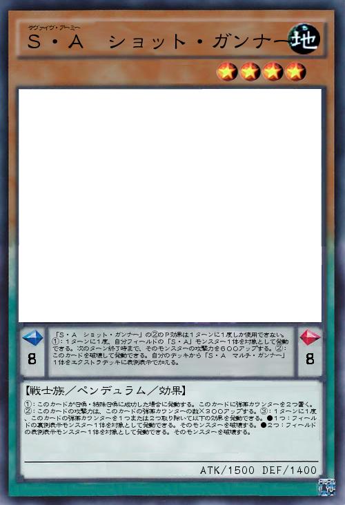 | 「S・A ショット・ガンナー」の②のP効果は1ターンに1度しか使用できない。①:1ターンに1度、自分フィールドの「S・A」モンスター1体を対象として発動できる。次のターン終了時まで、そのモンスターの攻撃力を600アップする。②:このカードを破壊して発動できる。自分のデッキから「S・A マルチ・ガンナー」1体をエクストラデッキに表側表示で加える。 | |||