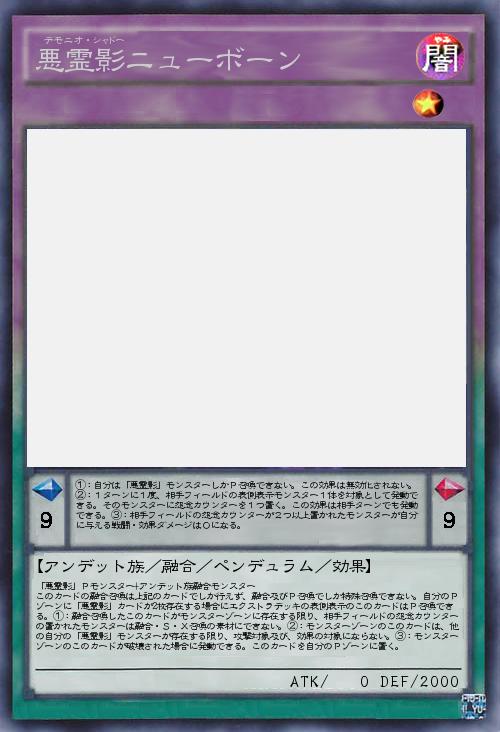 | 「悪霊影」Pモンスター+アンデット族融合モンスター このカードの融合召喚は上記のカードでしか行えず、融合及びP召喚でしか特殊召喚できない。自分のPゾーンに「悪霊影」カードが2枚存在する場合にエクストラデッキの表側表示のこのカードはP召喚できる。①:融合召喚したこのカードがモンスターゾーンに存在する限り、相手フィールドの怨念カウンターの置かれたモンスターは融合・S・X召喚の素材にできない。②:モンスターゾーンのこのカードは、他の自分の「悪霊影」モンスターが存在する限り、攻撃対象及び、効果の対象にならない。③:モンスターゾーンのこのカードが破壊された場合に発動できる。このカードを自分のPゾーンに置く。 | |||