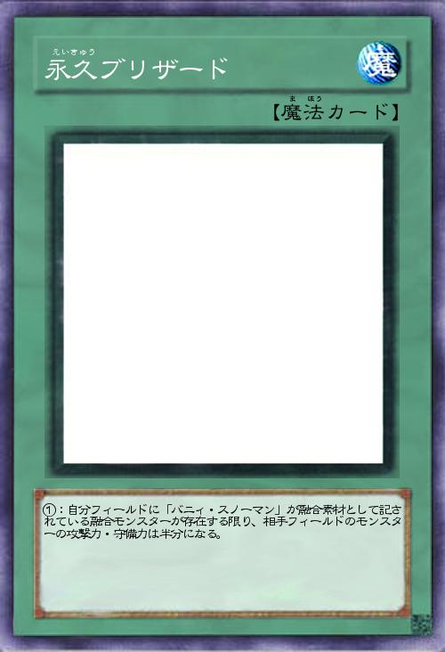 | ①:自分フィールドに「バニィ・スノーマン」が融合素材として記されている融合モンスターが存在する限り、相手フィールドのモンスターの攻撃力・守備力は半分になる。 | |||