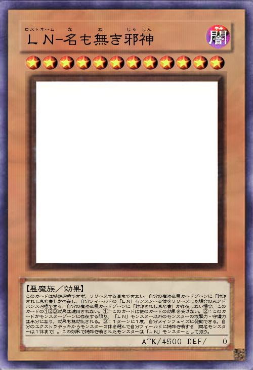 LNモンスターを5体喰らって顕現するアドバンスモンスター。他のLNと異なり、真名書が無い状態でもリリース不可というある種耐性的な効果が付与されている点が特徴。烈旋や壊獣で除去される事なくガンガン押していけます。真名書で封印してもテキスト外効果は封印出来なかったんですね……