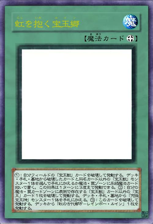 | ①:自分フィールドの「宝玉獣」カードを破壊して発動する。デッキ・手札・墓地から破壊したカードと同名カード以外の「宝玉獣」モンスター1体を選んで手札に加えるか魔法・罠ゾーンに永続魔法カード扱いで置く。この効果は1ターンに3度まで発動できる。②:自分の魔法・罠カードゾーンに表側で存在する「宝玉獣」カード以外の「宝玉」カード1枚を破壊して発動する。デッキ・手札・墓地から「究極宝玉神」モンスター1体を手札に加える。③:このカードを破壊して発動する。デッキから「虹の古代都市-レインボー・ルイン」1枚を発動する。 | |||
