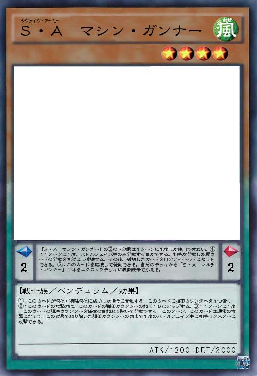 | 「S・A マシン・ガンナー」の②のP効果は1ターンに1度しか使用できない。①:1ターンに1度、バトルフェイズ中のみ発動する事ができる。相手が発動した罠カードの発動を無効にし破壊する。その後、破壊したカードを自分フィールドにセットできる。②:このカードを破壊して発動できる。自分のデッキから「S・A マルチ・ガンナー」1体をエクストラデッキに表側表示で加える。 | |||