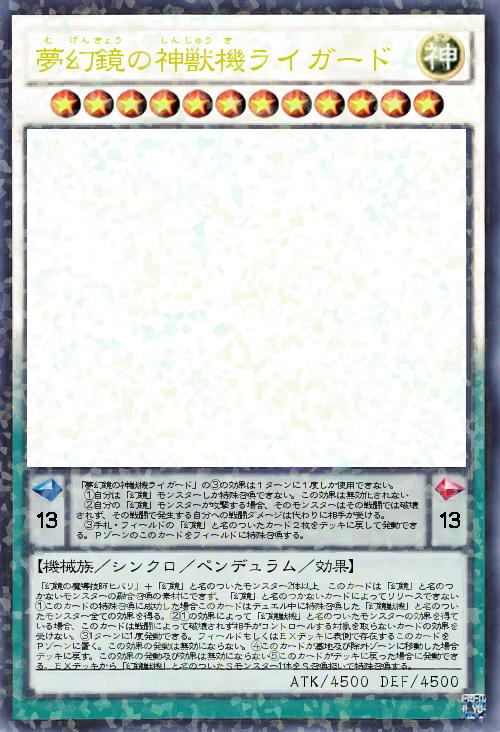 | 「夢幻鏡の神獣機ライガード」の③の効果は1ターンに1度しか使用できない。 ①自分は「幻鏡」モンスターしか特殊召喚できない。この効果は無効化されない ②自分の「幻鏡」モンスターが攻撃する場合、そのモンスターはその戦闘では破壊されず、その戦闘で発生する自分への戦闘ダメージは代わりに相手が受ける。 ③手札・フィールドの「幻鏡」と名のついたカード2枚をデッキに戻して発動できる。Pゾーンのこのカードをフィールドに特殊召喚する。 | |||