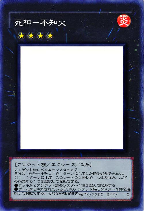 | アンデット族レベル4モンスター×2 自分は「死神-不知火」を1ターンに1度しか特殊召喚できない。 (1):1ターンに1度、このカードのX素材を1つ取り除き、以下の効果から1つを選択して発動できる。 ●デッキからアンデット族モンスター1体を選んで除外する。 ●ゲームから除外されている自分のアンデット族モンスター1体を選択して発動できる。それを特殊召喚する。 | |||