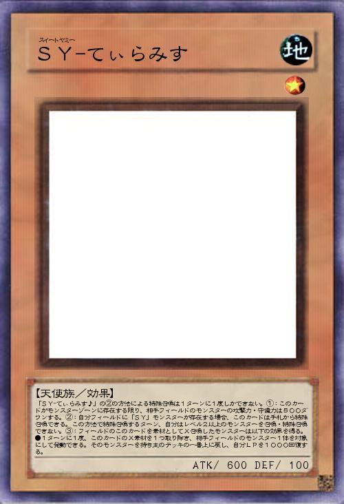 | 「SY-てぃらみす♪」の②の方法による特殊召喚は1ターンに1度しかできない。①:このカードがモンスターゾーンに存在する限り、相手フィールドのモンスターの攻撃力・守備力は500ダウンする。②:自分フィールドに「SY」モンスターが存在する場合、このカードは手札から特殊召喚できる。この方法で特殊召喚するターン、自分はレベル2以上のモンスターを召喚・特殊召喚できない。③:フィールドのこのカードを素材としてX召喚したモンスターは以下の効果を得る。●1ターンに1度、このカードのX素材を1つ取り除き、相手フィールドのモンスター1体を対象にして発動できる。そのモンスターを持ち主のデッキの一番上に戻し、自分LPを1000回復する。 | |||