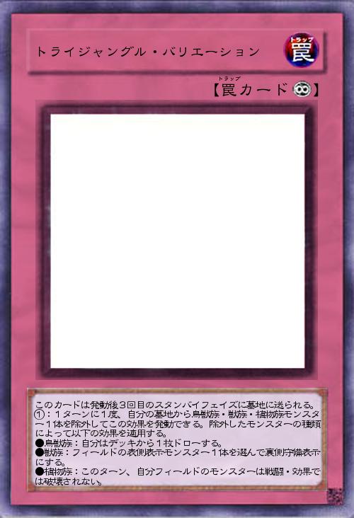 | このカードは発動後3回目のスタンバイフェイズに墓地に送られる。①:1ターンに1度、自分の墓地から鳥獣族・獣族・植物族モンスター1体を除外してこの効果を発動できる。除外したモンスターの種類によって以下の効果を適用する。 ●鳥獣族:自分はデッキから1枚ドローする。 ●獣族:フィールドの表側表示モンスター1体を選んで裏側守備表示にする。 ●植物族:このターン、自分フィールドのモンスターは戦闘・効果では破壊されない。 | |||