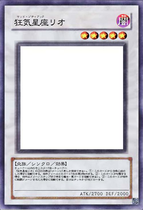 | チューナー以外のモンスター1体-チューナー 「狂気星座リオ」の③の効果は1ターンに1度しか使用できない。①:このカードがS召喚に成功した場合に発動できる。相手フィールドのカード1枚を選び除外する。②:このカードが攻撃する場合、相手はダメージステップ終了時まで魔法・罠カードを発動できない。③:このカードが相手に戦闘ダメージを与えた場合に発動できる。自分はデッキから1枚ドローする。 | |||