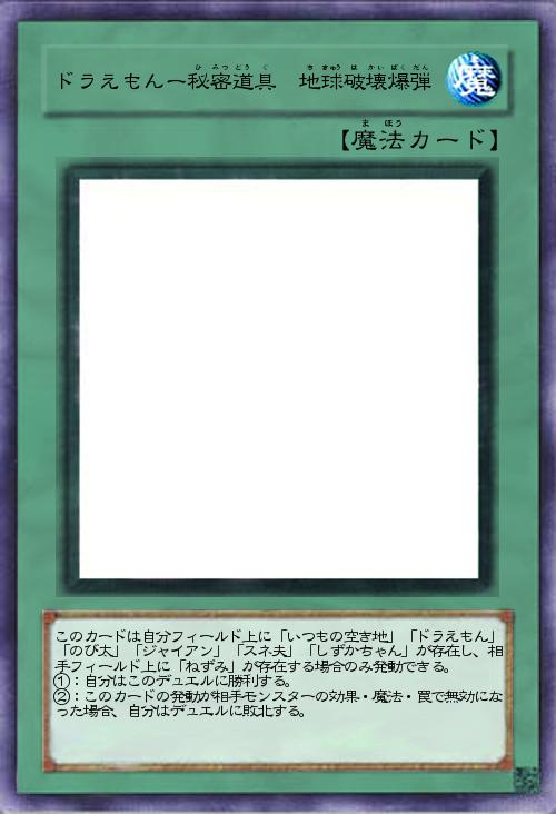 | このカードは自分フィールド上に「いつもの空き地」「ドラえもん」「のび太」「ジャイアン」「スネ夫」「しずかちゃん」が存在し、相手フィールド上に「ねずみ」が存在する場合のみ発動できる。 ①:自分はこのデュエルに勝利する。 ②:このカードの発動が相手モンスターの効果・魔法・罠で無効になった場合、自分はデュエルに敗北する。 | |||