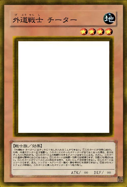 | 「外道戦士 チーター」はデッキに1枚しか入れることができない。①このカードが召喚に成功した時、外道カウンターを3個置く。このカードにのったカウンターが全てなくなった場合、自分はデュエルに敗北する。②このカードとの戦闘でおきるダメージは全て0となる。ただし、このカードの直接攻撃時には0にならない。③このカードは戦闘・効果では破壊できず、効果にも選ばれない。④このカードがフィールド上に存在する限り、お互いにLPを回復できない。⑤このカードはリリースできず、また、シンクロ・エクシーズ・儀式・融合素材にも使用できない。⑥自分のエンドフェイズ時毎に、このカードに乗ったカウンターを一つ取り除く。 | |||
