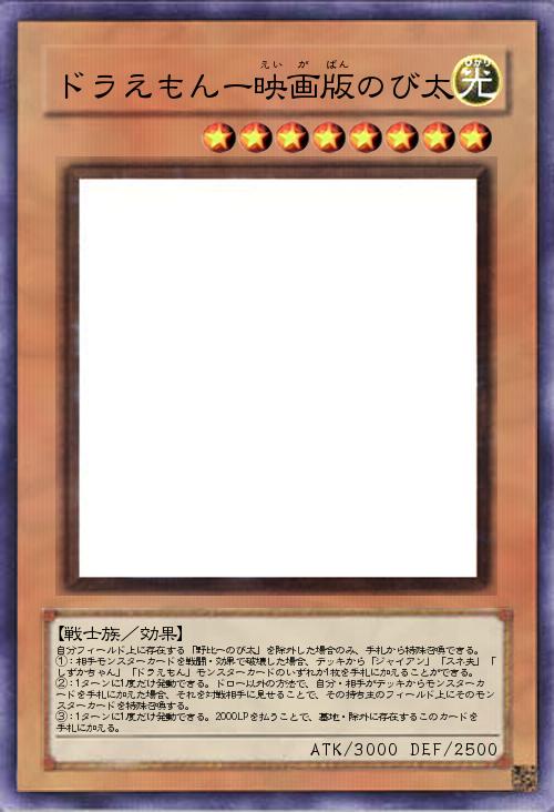 | 自分フィールド上に存在する「野比ーのび太」を除外した場合のみ、手札から特殊召喚できる。 ①:相手モンスターカードを戦闘・効果で破壊した場合、デッキから「ジャイアン」「スネ夫」「しずかちゃん」「ドラえもん」モンスターカードのいずれか1枚を手札に加えることができる。 ②:1ターンに1度だけ発動できる。ドロー以外の方法で、自分・相手がデッキからモンスターカードを手札に加えた場合、それを対戦相手に見せることで、その持ち主のフィールド上にそのモンスターカードを特殊召喚する。 ③:1ターンに1度だけ発動できる。2000LPを払うことで、墓地・除外に存在するこのカードを手札に加える。 | |||