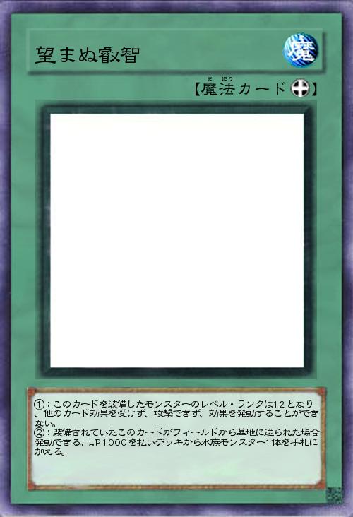 | ①:このカードを装備したモンスターのレベル・ランクは12となり、他のカード効果を受けず、攻撃できず、効果を発動することができない。 ②:装備されていたこのカードがフィールドから墓地に送られた場合発動できる。LP1000を払いデッキから水族モンスター1体を手札に加える。 | |||