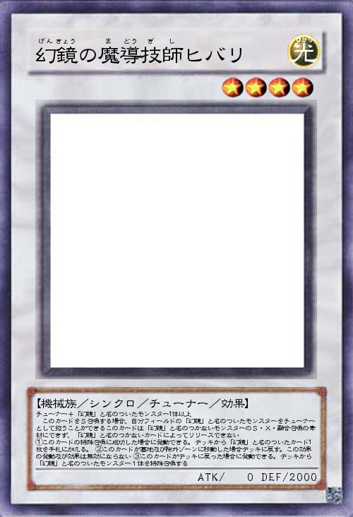 | チューナー+「幻鏡」と名のついたモンスター1体以上 このカードをS召喚する場合、自分フィールドの「幻鏡」と名のついたモンスターをチューナーとして扱うことができるこのカードは「幻鏡」と名のつかないモンスターのS・X・融合召喚の素材にできず、「幻鏡」と名のつかないカードによってリリースできない ①このカードの特殊召喚に成功した場合に発動できる。デッキから「幻鏡」と名のついたカード1枚を手札に加える。 ②このカードが墓地及び除外ゾーンに移動した場合デッキに戻す。この効果の発動及び効果は無効にならない ③このカードがデッキに戻った場合に発動できる。デッキから「幻鏡」と名のついたモンスター1体を特殊召喚する | |||