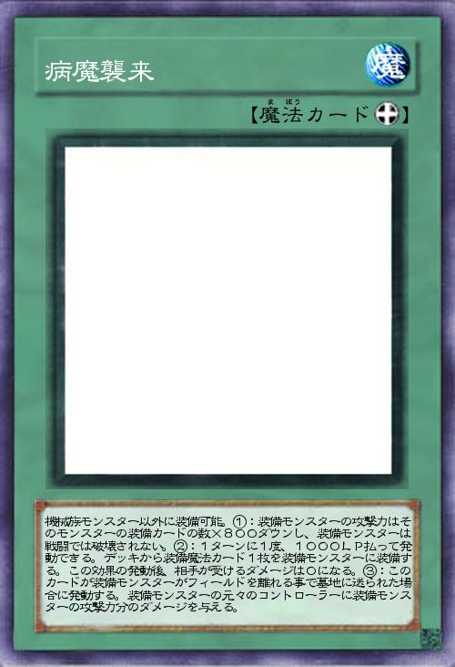 装備モンスターの打点を装備カードの数×800ダウンさせ、戦闘破壊をさせなくすると、状況によってはサンドバックに出来そうですね。そして1000払ってデッキから装備魔法を装備モンスターに追加で装備させることができる効果。これでもう1枚の病魔襲来を装備してその病魔襲来でさらに病魔を流行らせていけば打点の高いモンスターも、病がかさんでめちゃくちゃ弱体化されますね。そして装備モンスターがフィールドを離れることで、墓地へ行けば装備モンスターの打点分のダメージを相手に与えることができると強力ですね。