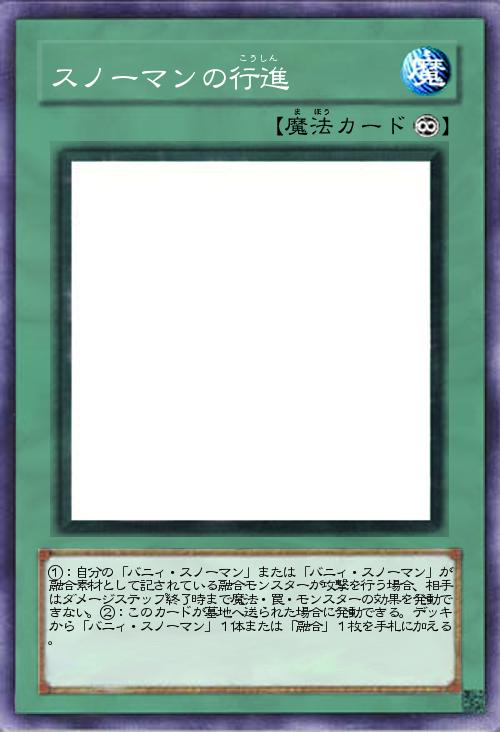 | ①:自分の「バニィ・スノーマン」または「バニィ・スノーマン」が融合素材として記されている融合モンスターが攻撃を行う場合、相手はダメージステップ終了時まで魔法・罠・モンスターの効果を発動できない。②:このカードが墓地へ送られた場合に発動できる。デッキから「バニィ・スノーマン」1体または「融合」1枚を手札に加える。 | |||