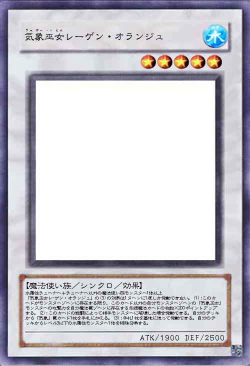 | 水属性チューナー+チューナー以外の魔法使い族モンスター1体以上 「気象巫女レ-ゲン・オランジュ」の(3)の効果は1ターンに1度しか発動できない。(1):このカードがモンスターゾーンに存在する限り、このカード以外の自分モンスターゾーンの「気象巫女」モンスターの攻撃力を自分魔法罠ゾーンに存在する永続魔法カードの枚数×200ポイントアップする。(2):このカードの戦闘によって相手モンスターに破壊した場合発動できる。自分のデッキから「気象」罠カード1枚を手札に加える。(3):手札1枚を墓地に送って発動できる。自分のデッキからレベル3以下の水属性モンスター1体を特殊召喚する。 | |||