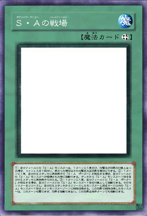 | ①:自分フィールドの「S・A」モンスターは、1ターンに1度だけ、攻撃及び効果の対象となった場合、コイントスを1回行い、表だった場合はその攻撃または効果を無効にできる。②:1ターンに1度、自分のEXデッキに表側表示で「S・A ポーター」が存在する場合、自分フィールドの「S・A」モンスターが破壊された時に発動できる。デッキから「S・A」モンスター1体を自分のEXデッキに表側表示で加える。③:1ターンに1度、自分フィールドに「S・A ポーター」が存在する場合、自分フィールドの「S・A」モンスター1体を対象として発動できる。そのモンスターをリリースし、自分のEXデッキからリリースしたモンスターと同名カード以外の「S・A」モンスター1体をメインモンスターゾーンに特殊召喚する。この効果で特殊召喚したモンスターは、このターン攻撃できず、効果を発動できない。この効果は相手ターンでも発動できる。 | |||