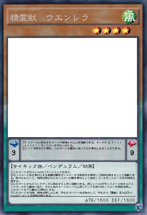 | ①このカードが[Groovestar]カードとしても扱う。 ②モンスター2体を素材とする風属性融合モンスターを召喚条件を無視して特殊召喚することで発動できる。除外されていて、特殊召喚されたモンスターが融合素材として指定しているモンスター2体を特殊召喚する。 ③このカードがエクストラデッキに存在するときに発動できる。同じレベルのPモンスター2体をエクストラデッキから墓地へ送り、その二枚のカードのレベルと同じランクを持つXモンスターを特殊召喚し、このカードを下に重ねてX素材とする。 ④このカードが召喚、特殊召喚されたとき、手札のカード一枚を除外して、手札から「霊獣」または[Groovestar]カードを特殊召喚できる。 | |||
