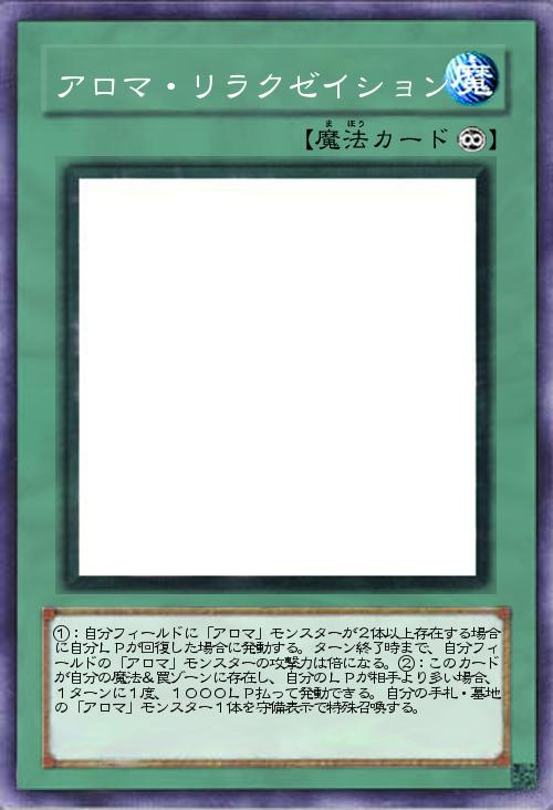 | ①:自分フィールドに「アロマ」モンスターが2体以上存在する場合に自分LPが回復した場合に発動する。ターン終了時まで、自分フィールドの「アロマ」モンスターの攻撃力は倍になる。②:このカードが自分の魔法&罠ゾーンに存在し、自分のLPが相手より多い場合、1ターンに1度、1000LP払って発動できる。自分の手札・墓地の「アロマ」モンスター1体を守備表示で特殊召喚する。 | |||