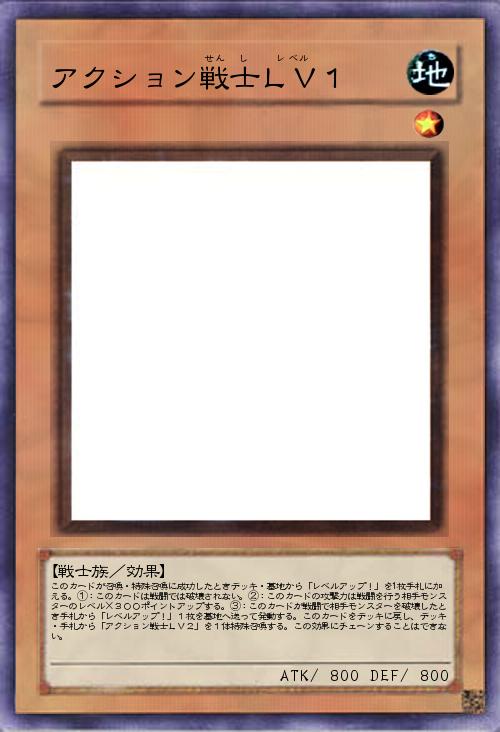 | このカードが召喚・特殊召喚に成功したときデッキ・墓地から「レベルアップ!」を1枚手札に加える。①:このカードは戦闘では破壊されない。②:このカードの攻撃力は戦闘を行う相手モンスターのレベル×300ポイントアップする。③:このカードが戦闘で相手モンスターを破壊したとき手札から「レベルアップ!」1枚を墓地へ送って発動する。このカードをデッキに戻し、デッキ・手札から「アクション戦士LV2」を1体特殊召喚する。この効果にチェーンすることはできない。 | |||