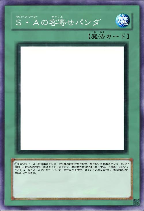 | ①:自分フィールドの弾薬カウンターを任意の数だけ取り除き、取り除いた弾薬カウンターの半分の数(小数点切り捨て)だけコイントスを行い、表の数だけ自分はドローする。その後、自分フィールドに「S・A ミリタリー・パンダ」が存在する場合、コイントスを2回行い、表の数だけ自分はドローできる。 | |||
