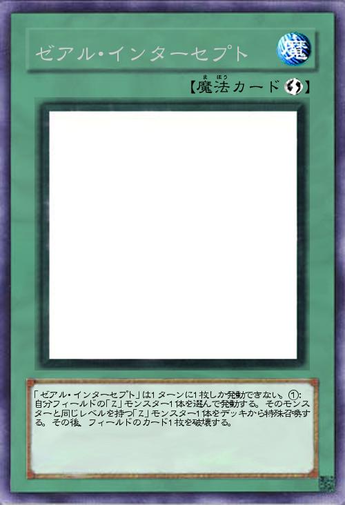 | 「ゼアル・インターセプト」は1ターンに1枚しか発動できない。①:自分フィールドの「Z」モンスター1体を選んで発動する。そのモンスターと同じレベルを持つ「Z」モンスター1体をデッキから特殊召喚する。その後、フィールドのカード1枚を破壊する。 | |||