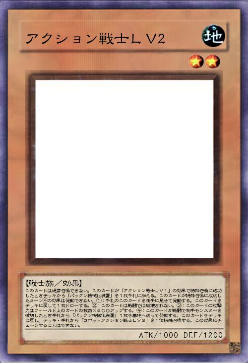 | このカードは通常召喚できない。このカードが「アクション戦士LV1」の効果で特殊召喚に成功したときデッキから「パックン機械化装置」を1枚手札に加える。このカードが特殊召喚に成功したターン④の効果は発動できない。①:手札のこのカードを相手に見せて発動する。このカードをデッキに戻して1枚ドローする。②:このカードは戦闘では破壊されない。③:このカードの攻撃力はフィールド上のカードの枚数×500アップする。④:このカードが戦闘で相手モンスターを破壊したとき手札から「パックン機械化装置」1枚を墓地へ送って発動する。このカードをデッキに戻し、デッキ・手札から「ロボットアクション戦士LV3」を1体特殊召喚する。この効果にチェーンすることはできない。 | |||