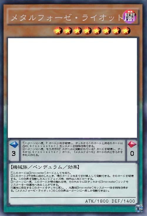 | ①一ターンに一度、Pカード二枚を破壊し、デッキからこのカードと同名のカード以外の[Groovestar]モンスターを特殊召喚できる。 ②一ターンに一度、もう片方のPスケールに発動されているPカードを破壊し、デッキから[Groovestar]カード、「メタルフォーゼ」カードの内どちらかを手札に加える。 | |||