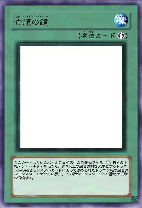 | このカードは互いのバトルフェイズ中のみ発動できる。①:自分の手札・フィールド・墓地から、3体以上の融合素材を必要とするドラゴン族の融合モンスターカードによって決められたドラゴン族の融合素材モンスターをデッキに戻し、その融合モンスター1体を墓地から融合召喚する。 | |||