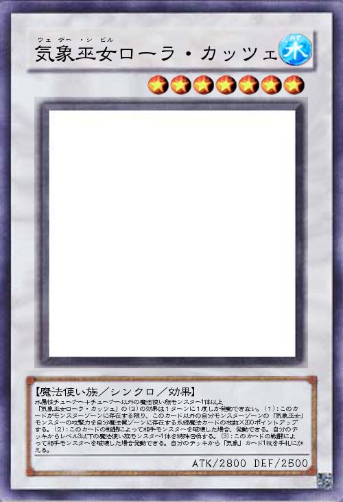 | 水属性チューナー+チューナー以外の魔法使い族モンスター1体以上 「気象巫女ローラ・カッツェ」の(3)の効果は1ターンに1度しか発動できない。(1):このカードがモンスターゾーンに存在する限り、このカード以外の自分モンスターゾーンの「気象巫女」モンスターの攻撃力を自分魔法罠ゾーンに存在する永続魔法カードの枚数×200ポイントアップする。(2):このカードの戦闘によって相手モンスターを破壊した場合、発動できる。自分のデッキからレベル3以下の魔法使い族モンスター1体を特殊召喚する。(3):このカードの戦闘によって相手モンスターを破壊した場合発動できる。自分のデッキから「気象」カード1枚を手札に加える。 | |||