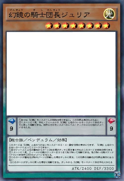 | このカードは「幻鏡」と名のつかないモンスターのS・X・融合召喚の素材にできず、「幻鏡」と名のつかないカードによってリリースできない ①自分フィールド上及び墓地からカード2枚を選びデッキに戻す事で手札のこのカードを特殊召喚できる②1ターンに1度、フィールドの鏡カウンターを3つまで取り除いて発動できる。取り除いた鏡カウンター1つにつき相手に500のダメージを与える。 ③このカードが墓地及び除外ゾーンに移動した場合デッキに戻す。この効果の発動及び効果は無効にならない ④このカードがデッキに戻った場合に発動できる。デッキから「幻鏡」モンスター1体を手札に加える。 | |||