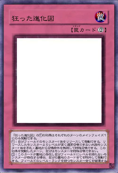 | 「狂った進化図」の①の効果はそれぞれのターンのメインフェイズ1にのみ発動できる。 ①:自分フィールドのモンスター1体をリリースして発動できる。リリースしたモンスターよりレベルが高く通常召喚できない水族モンスター1体を手札・墓地から召喚条件を無視して特殊召喚できる。この効果を発動したターン、自分はモンスターを特殊召喚できない。 ②:このカードが墓地に存在し自分フィールドにレベルを持たないモンスターが存在する場合、自分の墓地のカード全てを除外して発動できる。フィールドのレベル・ランクを持つモンスター全てを破壊する。 | |||