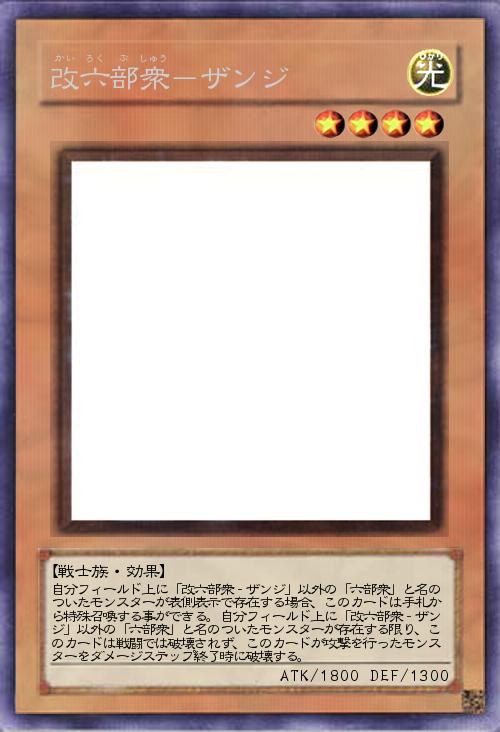 | 自分フィールド上に「改六部衆‐ザンジ」以外の「六部衆」と名のついたモンスターが表側表示で存在する場合、このカードは手札から特殊召喚する事ができる。自分フィールド上に「改六部衆‐ザンジ」以外の「六部衆」と名のついたモンスターが存在する限り、このカードは戦闘では破壊されず、このカードが攻撃を行ったモンスターをダメージステップ終了時に破壊する。 | |||