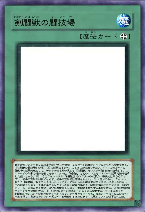 | 相手がモンスターを3回以上特殊召喚した場合、このカードは相手ターンに手札から発動できる。「剣闘獣の闘技場」の(3),(4)の効果は1ターンに1度しか使用できない。(1):このカードの発動時の効果処理として、デッキから名前の異なる「剣闘獣」モンスター2体を特殊召喚する。このカードの効果で特殊召喚したモンスターは「剣闘獣」と名のついたモンスターの効果で特殊召喚した扱いとなる。(2):自分フィールドの「剣闘獣」モンスターの攻撃力・守備力は500アップし、相手の効果の対象にならず、相手の効果では破壊されない。(3):自分の手札・フィールドから「剣闘獣」融合モンスターカードによって決められた融合素材モンスターをデッキに戻し、その融合モンスター1体をエクストラデッキから融合召喚する。特殊召喚されたモンスターが相手フィールドに存在する場合、自分の墓地のモンスターも融合素材とする事ができる。この効果は相手 | |||