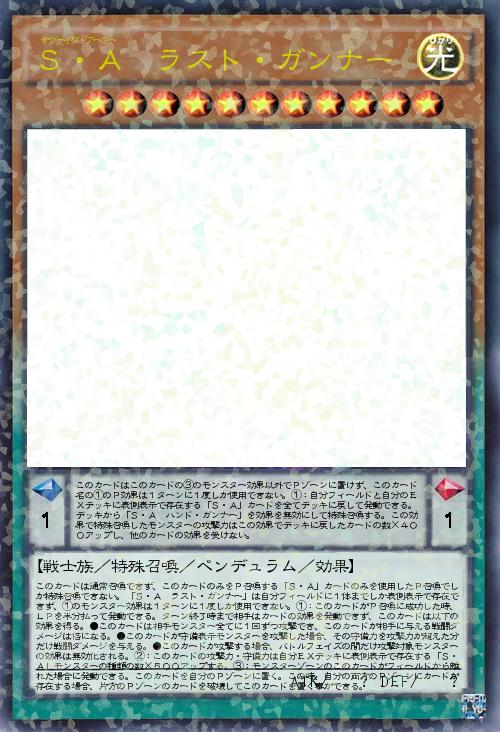 | このカードは通常召喚できず、このカードのみをP召喚する「S・A」カードのみを使用したP召喚でしか特殊召喚できない。「S・A ラスト・ガンナー」は自分フィールドに1体までしか表側表示で存在できず、①のモンスター効果は1ターンに1度しか使用できない。①:このカードがP召喚に成功した時、LPを半分払って発動できる。ターン終了時まで相手はカードの効果を発動できず、このカードは以下の効果を得る。●このカードは相手モンスター全てに1回ずつ攻撃でき、このカードが相手に与える戦闘ダメージは倍になる。●このカードが守備表示モンスターを攻撃した場合、その守備力を攻撃力が超えた分だけ戦闘ダメージを与える。●このカードが攻撃する場合、バトルフェイズの間だけ攻撃対象モンスターの効果は無効化される。②:このカードの攻撃力・守備力は自分EXデッキに表側表示で存在する「S・A」モンスターの種類の数×500アップする。③: | |||