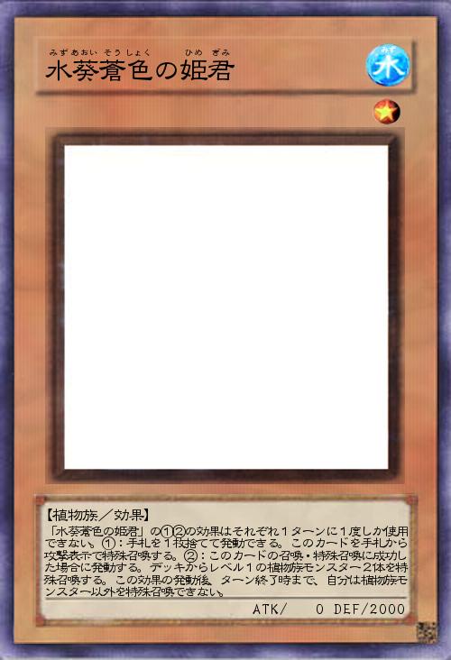 | 「水葵蒼色の姫君」の①②の効果はそれぞれ1ターンに1度しか使用できない。①:手札を1枚捨てて発動できる。このカードを手札から攻撃表示で特殊召喚する。②:このカードの召喚・特殊召喚に成功した場合に発動する。デッキからレベル1の植物族モンスター2体を特殊召喚する。この効果の発動後、ターン終了時まで、自分は植物族モンスター以外を特殊召喚できない。 | |||