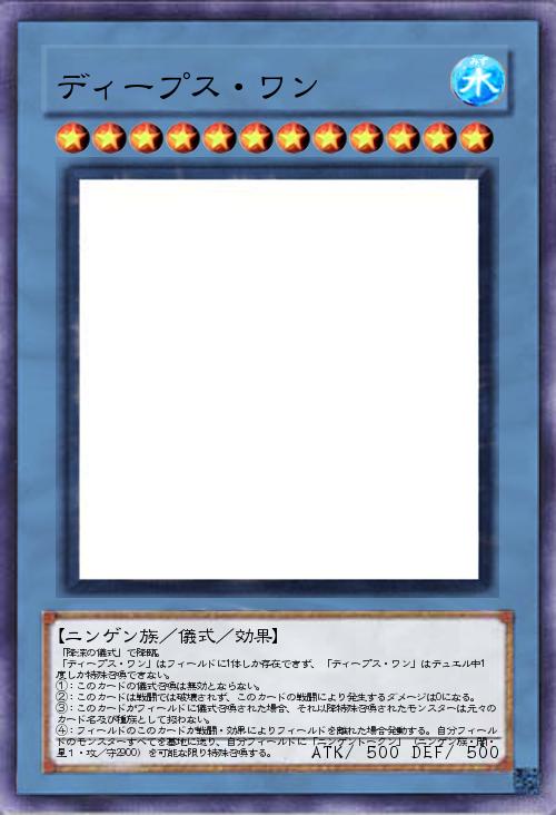 | 「降深の儀式」で降臨。 「ディープス・ワン」はフィールドに1体しか存在できず、「ディープス・ワン」はデュエル中1度しか特殊召喚できない。 ①:このカードの儀式召喚は無効とならない。 ②:このカードは戦闘では破壊されず、このカードの戦闘により発生するダメージは0になる。 ③:このカードがフィールドに儀式召喚された場合、それ以降特殊召喚されたモンスターは元々のカード名及び種族として扱わない。 ④:フィールドのこのカードが戦闘・効果によりフィールドを離れた場合発動する。自分フィールドのモンスターすべてを墓地に送り、自分フィールドに「ニンゲントークン」(ニンゲン族・闇・星1・攻/守2900)を可能な限り特殊召喚する。 | |||