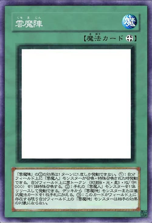 | 「雲魔陣」の②の効果は1ターンに1度しか発動できない。①:自分フィールド上に「雲魔人」モンスターが召喚・特殊召喚された時発動できる。自分フィールド上に雲トークン(天使族・光・星3・攻/守1000)を1体特殊召喚する。②:手札の「雲魔人」モンスターを1体リリースして発動できる。デッキから「雲魔神」モンスターまたは儀式魔法カードを1枚手札に加える。③:このカードがフィールド上に存在する限り自分フィールド上の「雲魔神」モンスターは相手の効果の対象にならない。 | |||