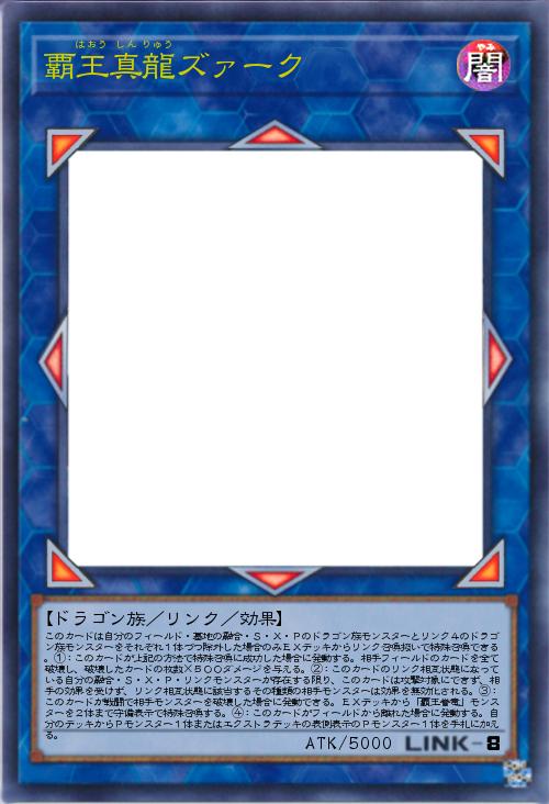| このカードは自分のフィールド・墓地の融合・S・X・Pのドラゴン族モンスターとリンク4のドラゴン族モンスターをそれぞれ1体づつ除外した場合のみEXデッキからリンク召喚扱いで特殊召喚できる。①:このカードが上記の方法で特殊召喚に成功した場合に発動する。相手フィールドのカードを全て破壊し、破壊したカードの枚数×500ダメージを与える。②:このカードのリンク相互状態になっている自分の融合・S・X・P・リンクモンスターが存在する限り、このカードは攻撃対象にできず、相手の効果を受けず、リンク相互状態に該当するその種類の相手モンスターは効果を無効化される。③:このカードが戦闘で相手モンスターを破壊した場合に発動できる。EXデッキから「覇王眷竜」モンスターを2体まで守備表示で特殊召喚する。④:このカードがフィールドから離れた場合に発動する。自分のデッキからPモンスター1体またはエクストラデッキの表側表示の | |||