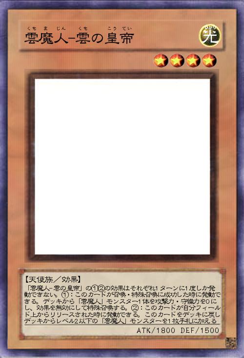 修正前の性能はやばいですね…。何より①に発動制限がなく、効果を無効化しないのがヤヴァイ。同名制限もないのでこのカードを召喚するだけで、皇帝が3体並び追加で1体雲魔人を呼ぶことができると非常に恐ろしい事になってそうですね。そして何気に②もエグイという。やはり発動制限は大切ですね。まぁ、修正しても強い事に変わりはないので、がんばってほしいところですね。」(2017-03-31 19:18)