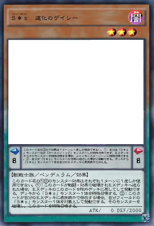 | このカード名の①②のモンスター効果はそれぞれ1ターンに1度しか使用できない。①:このカードが戦闘・効果で破壊されEXデッキへ送られた場合、EXデッキのこのカードを除外デッキに戻してして発動できる。デッキから「S*s」モンスター1体を特殊召喚する。②:このカードが自分のEXデッキに表側表示で存在する場合、自分フィールドの「S*s」モンスター1体を対象として発動できる。そのモンスターを破壊し、このカードを特殊召喚する。 | |||