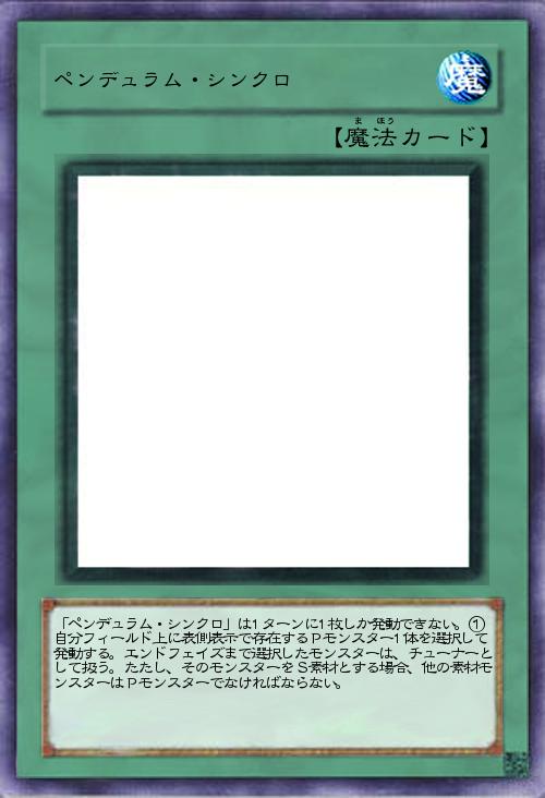 | 「ペンデュラム・シンクロ」は1ターンに1枚しか発動できない。①自分フィールド上に表側表示で存在するPモンスター1体を選択して発動する。エンドフェイズまで選択したモンスターは、チューナーとして扱う。たたし、そのモンスターをS素材とする場合、他の素材モンスターはPモンスターでなければならない。 | |||
