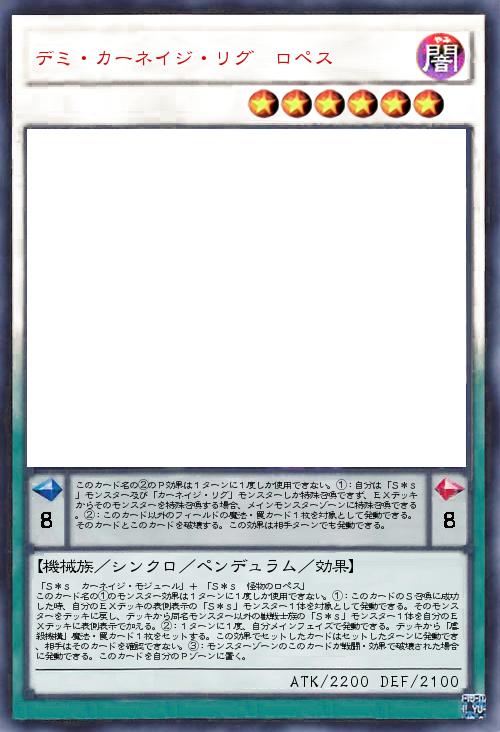 | 「S*s カーネイジ・モジュール」+ 「S*s 怪物のロペス」 このカード名の①のモンスター効果は1ターンに1度しか使用できない。①:このカードのS召喚に成功した時、自分のEXデッキの表側表示の「S*s」モンスター1体を対象として発動できる。そのモンスターをデッキに戻し、デッキから同名モンスター以外の獣戦士族の「S*s」モンスター1体を自分のEXデッキに表側表示で加える。②:1ターンに1度、自分メインフェイズで発動できる。デッキから「虐殺機構」魔法・罠カード1枚をセットする。この効果でセットしたカードはセットしたターンに発動でき、相手はそのカードを確認できない。③:モンスターゾーンのこのカードが戦闘・効果で破壊された場合に発動できる。このカードを自分のPゾーンに置く。 | |||