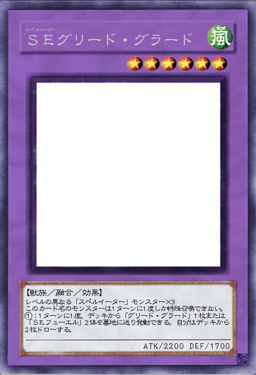 | レベルの異なる「スペルイーター」モンスター×3 このカード名のモンスターは1ターンに1度しか特殊召喚できない。①:1ターンに1度、デッキから「グリード・グラード」1枚または「SEフューエル」2体を墓地に送り発動できる。自分はデッキから2枚ドローする。 | |||