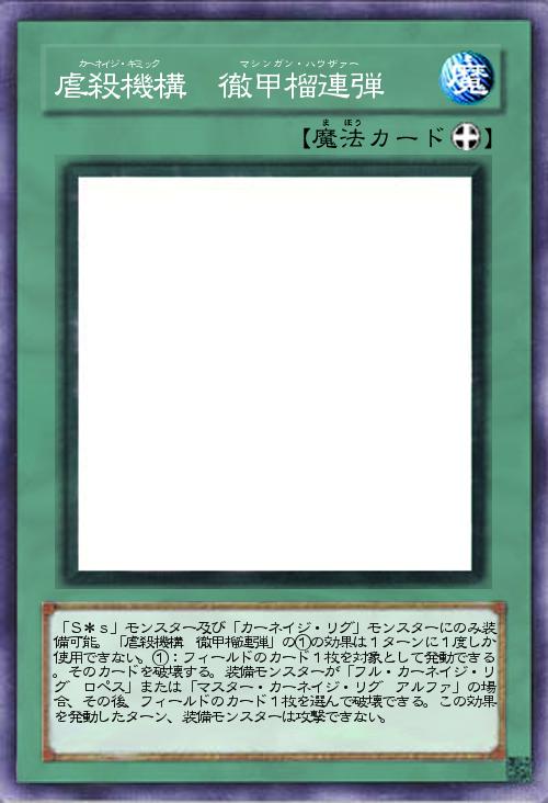 | 「S*s」モンスター及び「カーネイジ・リグ」モンスターにのみ装備可能。「虐殺機構 徹甲榴連弾」の①の効果は1ターンに1度しか使用できない。①:フィールドのカード1枚を対象として発動できる。そのカードを破壊する。装備モンスターが「フル・カーネイジ・リグ ロペス」または「マスター・カーネイジ・リグ アルファ」の場合、その後、フィールドのカード1枚を選んで破壊できる。この効果を発動したターン、装備モンスターは攻撃できない。 | |||