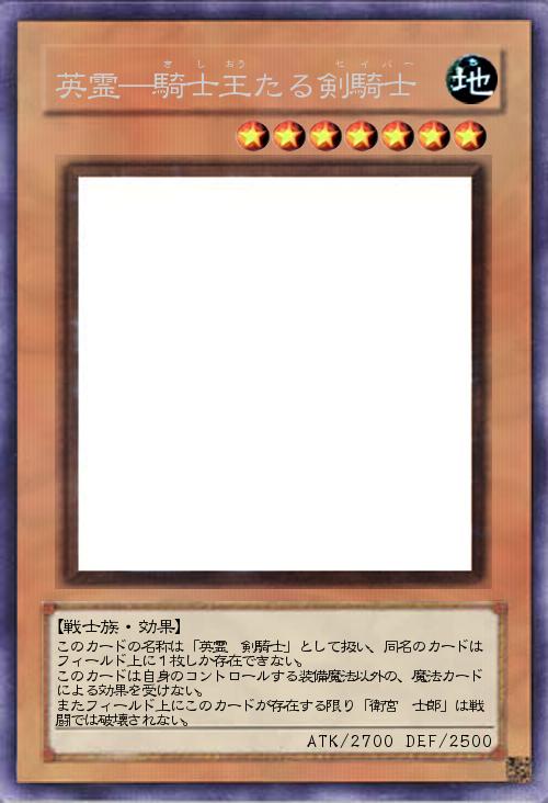 このカードの名称は「英霊 剣騎士」として扱い、同名のカードはフィールド上に1枚しか存在できない。 このカードは自身のコントロールする装備魔法以外の、魔法カードによる効果を受けない。 またフィールド上にこのカードが存在する限り「衛宮 士郎」は戦闘では破壊されない。 |