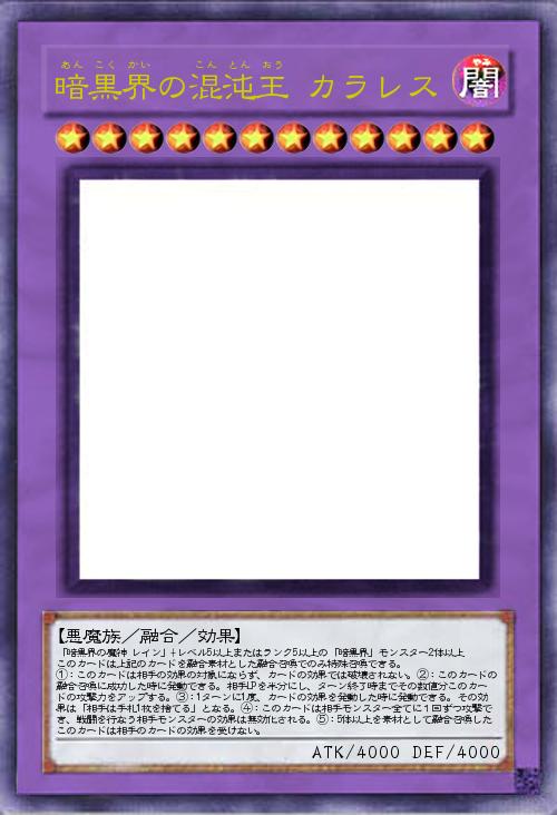 カラレスは以前にも投稿した事があるんですが、これまでずっとカード名を「暗黒界の混色王 カラレス」と勘違いしていたので、それを訂正するついでに効果も一新しました。