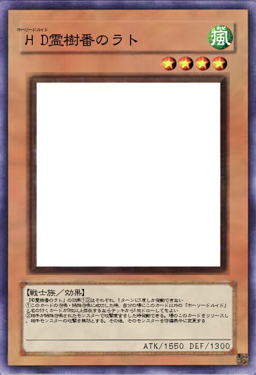 | 「HD霊樹番のラト」の効果①②はそれぞれ、1ターンに1度しか発動できない ①このカードの召喚・特殊召喚に成功した時、自分の場にこのカード以外の「ホーリードルイド」と名の付くカードが3枚以上存在するならデッキから1枚ドローしてもよい ②相手が特殊召喚されたモンスターで攻撃宣言をした時発動できる。場のこのカードをリリースし、相手モンスターの攻撃を無効とする。その後、そのモンスターを守備表示に変更する | |||