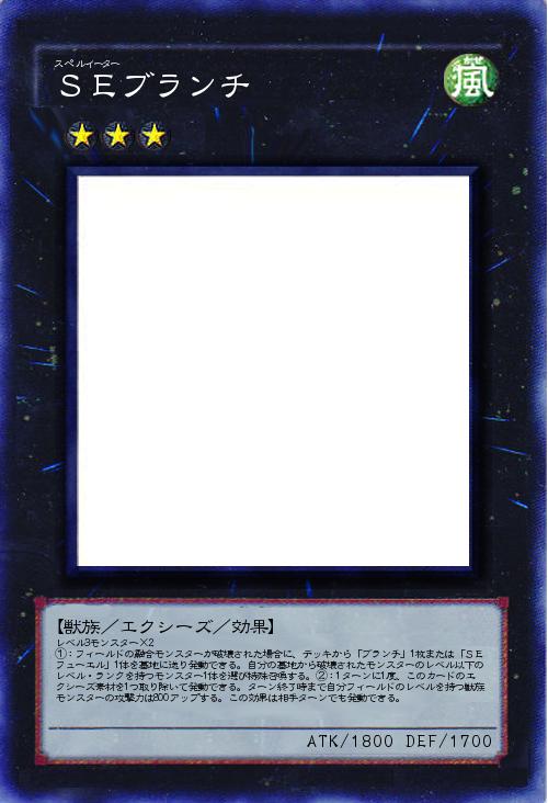 | レベル3モンスター×2 ①:フィールドの融合モンスターが破壊された場合に、デッキから「ブランチ」1枚または「SEフューエル」1体を墓地に送り発動できる。自分の墓地から破壊されたモンスターのレベル以下のレベル・ランクを持つモンスター1体を選び特殊召喚する。②:1ターンに1度、このカードのエクシーズ素材を1つ取り除いて発動できる。ターン終了時まで自分フィールドのレベルを持つ獣族モンスターの攻撃力は800アップする。この効果は相手ターンでも発動できる。 | |||